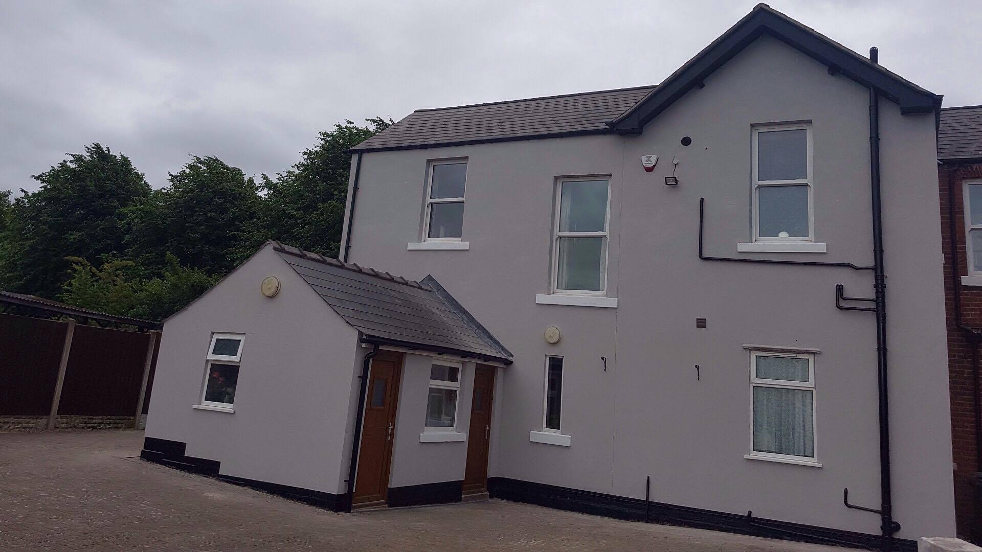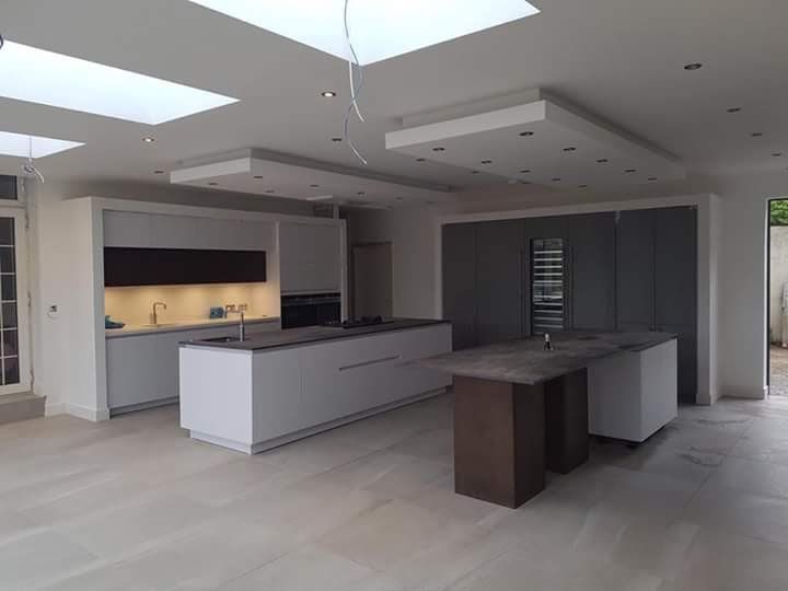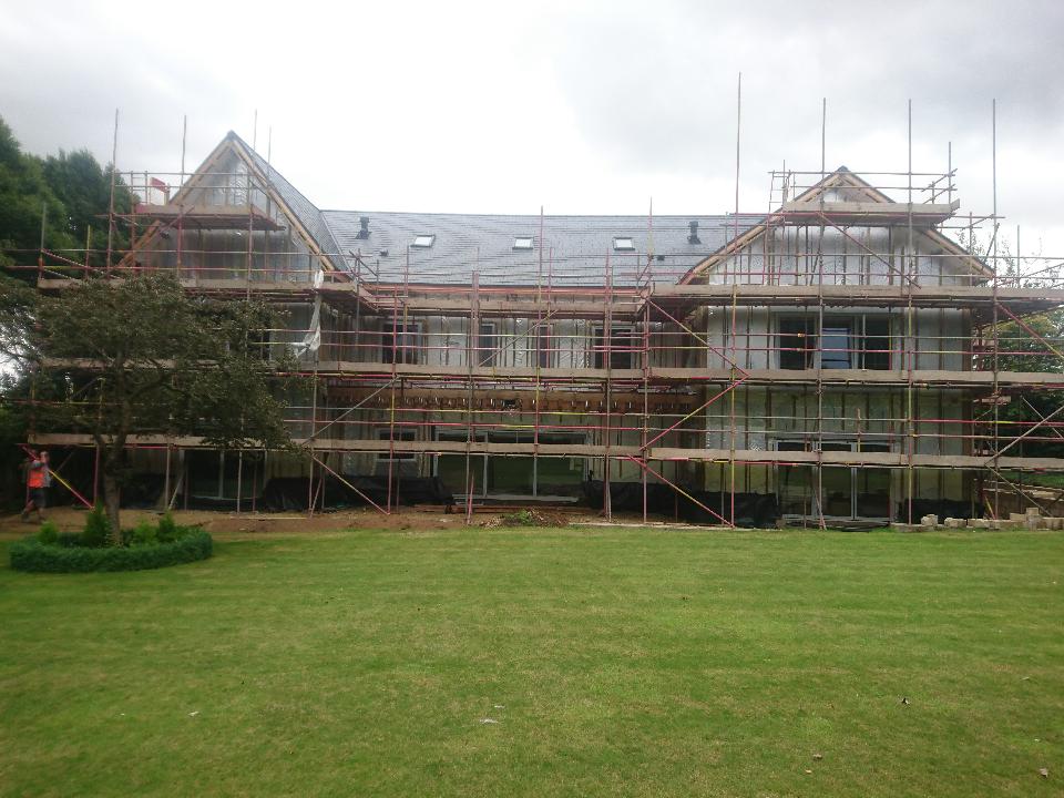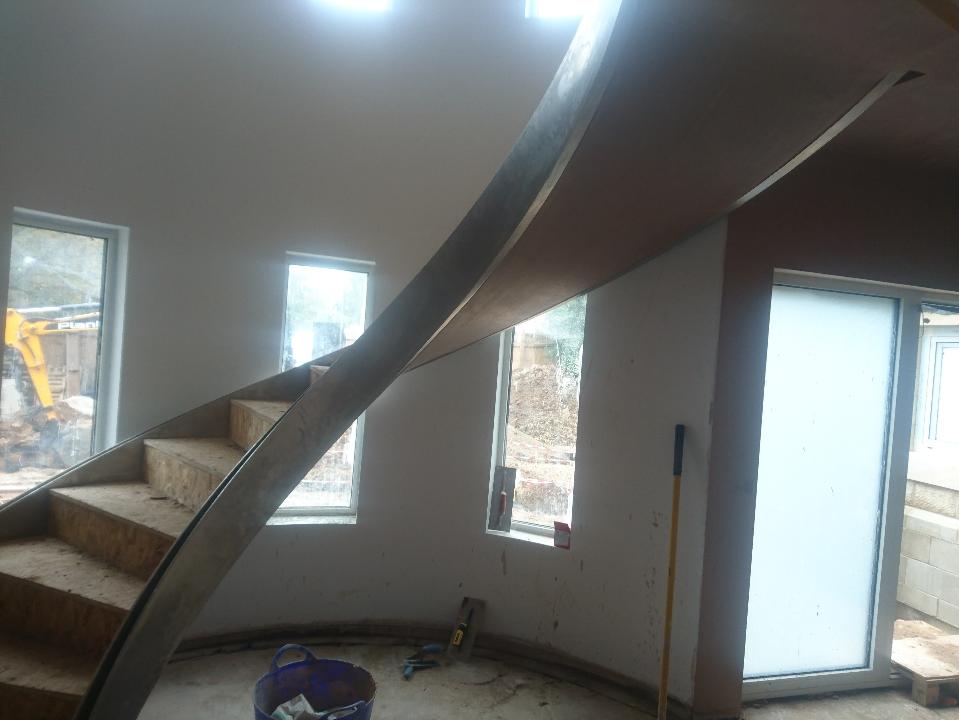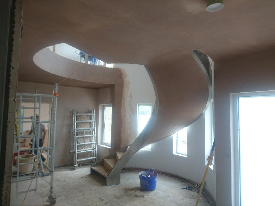 New timber frame build, with render carrier board, polymer render and silicon thin coat finish, with a full board and skim on the internal. New bespoke staircase fitted and ceiling coffer detail to match a kitchen island below all framed, boarded with bendy board and plastered.