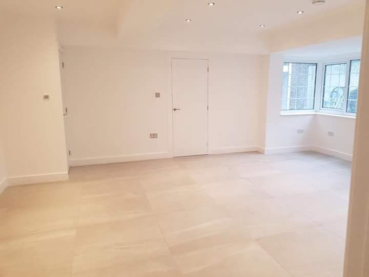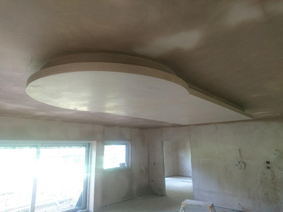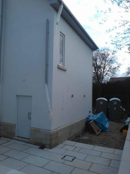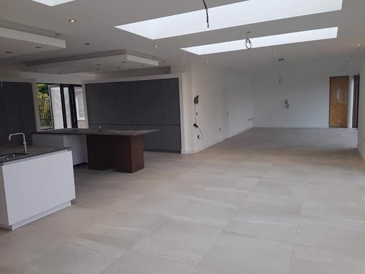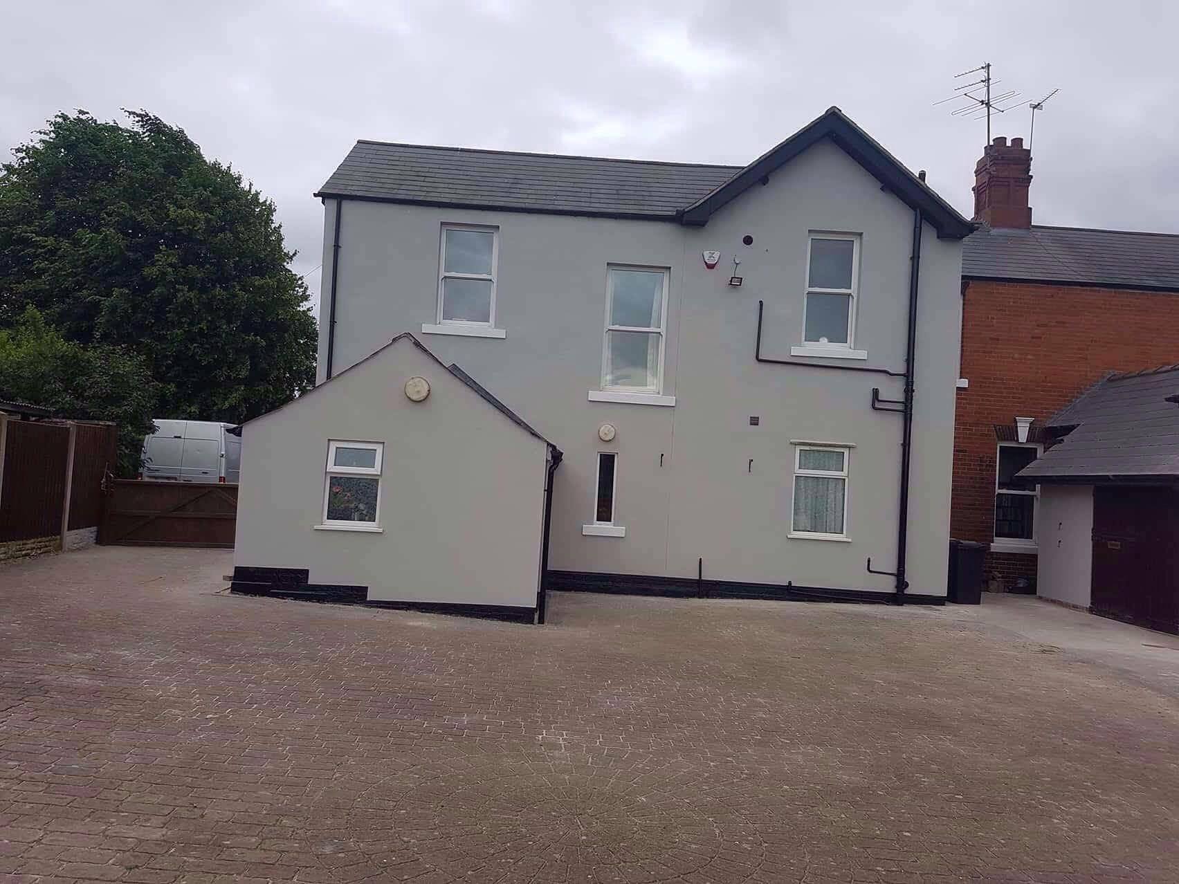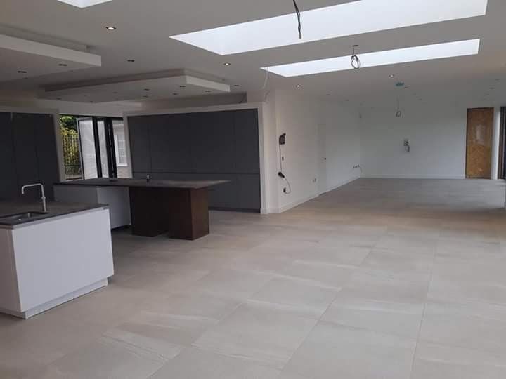 New timber frame build, with render carrier board, polymer render and silicon thin coat finish, with a full board and skim on the internal. New bespoke staircase fitted and ceiling coffer detail to match a kitchen island below all framed, boarded with bendy board and plastered.